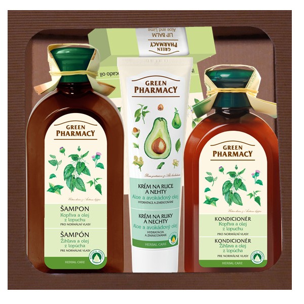 Dárková sada pro normální vlasy obsahuje: šampon 350 ml, kondicionér 300 ml, krém na ruce a nehty 100 ml, balzám na rty 3,6 g
