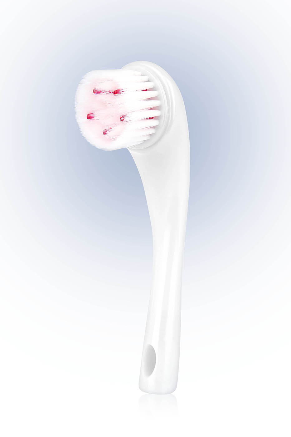 Jemný čistící kartáček, vhodný pro čištění obličeje. Čistí pleť do hloubky a zanechá ji svěží a hladkou. Díky flexibilním syntetickým štětinám a speciálním silikonovým tvarům uvnitř kartáčku, důkladně odstraní všechny nečistoty z pleti. Používejte navlhčený kartáček s trochou čistícího gelu či krému, který běžně používáte. Nepoužívejte na podrážděnou pleť. Pokud bude pleť při použití či po použití pálit nebo štípat, kartáček nepoužívejte. Při použití kartáčkem na pleť moc netlačte.