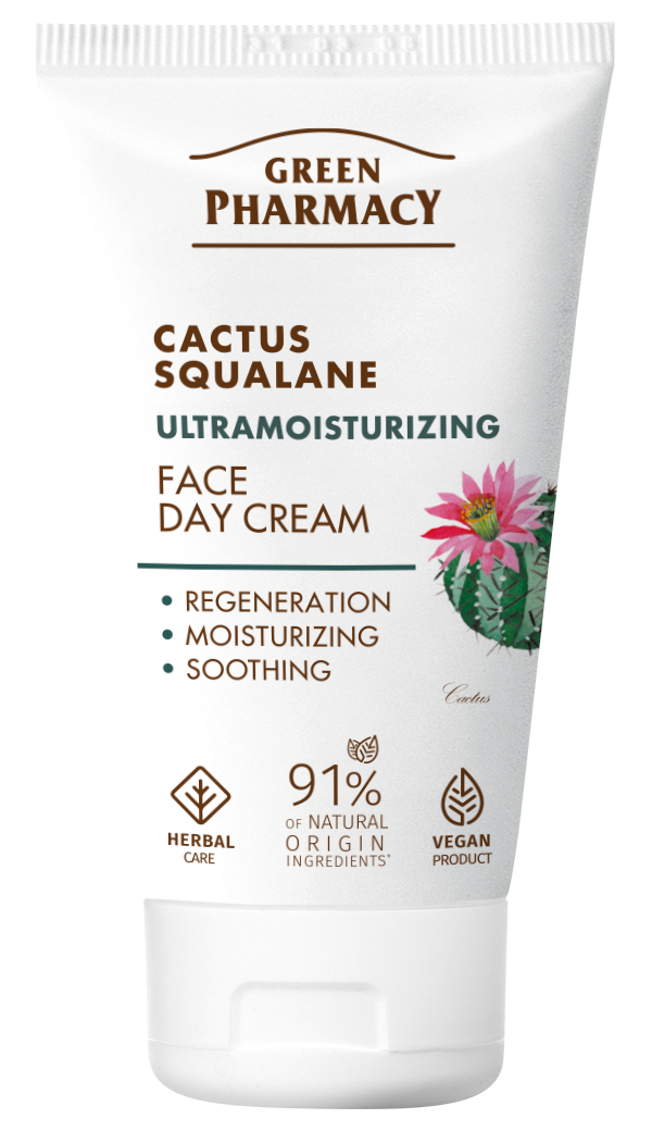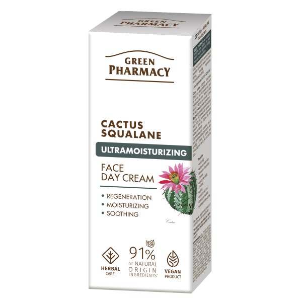 Extrakt z kaktusu je ideální složkou používanou v péči o suchou i mastnou pleť. Poskytuje vynikající hydrataci a tonizaci pokožky. Díky vysokému obsahu vitamínů a minerálů dodává pleti pevnost a zářivý vzhled. Squalan je rostlinná složka získaná z olivového oleje, která má širokospektrální účinek na pokožku. Hhydratuje ji a zabraňuje nadměrné ztrátě vlhkosti. Dodává pokožce jemnost a pružnost. Výsledkem je zdravá a zářivá pleť, snížená viditelnost vrásek s vyrovnaným tónem pleti. Krém je vhodný jako podklad pod makeup. Obsahuje až 91% složek přírodního původu.