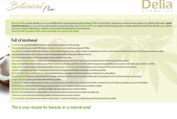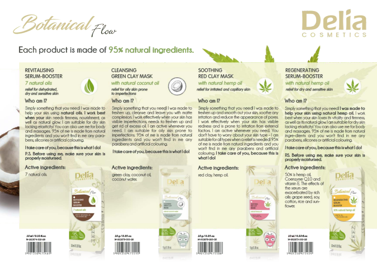 Regenerační sérum, vhodné pro suchou a citlivou pleť. Obsahuje přírodní konopný olej. Sérum lze použít na obličej, krk i dekolt. Lze jej použít k masáži obličeje či k použití pod Váš běžný krém. Konopný olej chrání pleť před vysoušením, ztrátou vlhkosti a dodává ji výživu a svěžest. Koenzym Q10 a vitamín E mají antioxidační vlastnosti s omlazujícími a rekonstruujícími účinky. Přípravek obsahuje 95% přírodních složek.