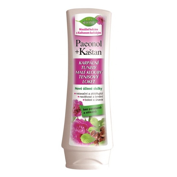 Balzám Paeonol s extraktem z kaštanu, mentolem, kafrem, eukalyptem a dalšími složkami působí relaxačně a blahodárně na pohybová aparát. Obsahuje též konopný olej a extrakt z listové části rostliny. Vhodný k relaxační a uvolňující masáži pokožky. Zejména na karpální tunely, tenisový loket, kolena, klouby či svalovém zatuhnutí. Bez obsahu parabenů a silikonů.