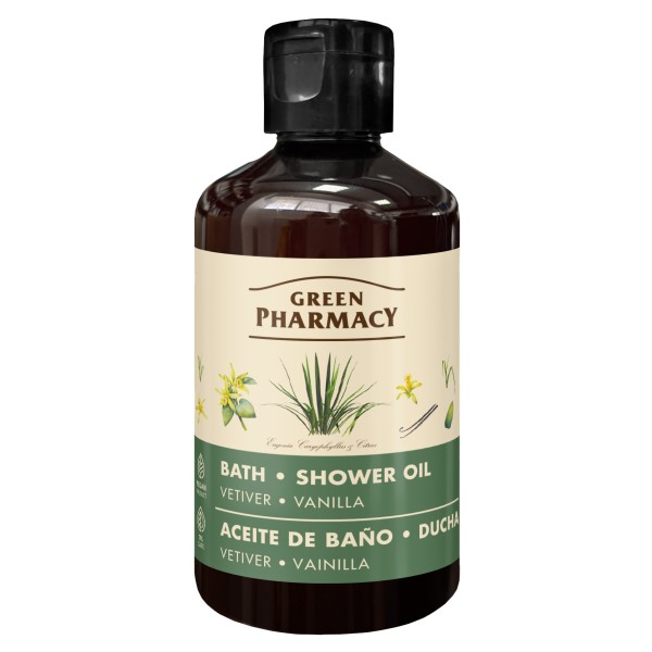 Koupelový a sprchový olej s vůní vetiveru a vanilky. Lze použít jako klasický sprchový gel a nebo jako pěnu do koupele. Esenciální olej vetiver působí uklidňujícím dojmem, posiluje nervový systém a psychiku a naplňuje optimismem. Vanilkový olej uvolňuje, zlepšuje pamět a pomáhá s koncentrací.