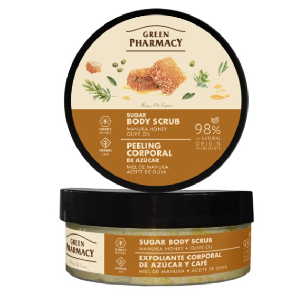 Cukrovo-solný tělový peeling s extraktem z medu a olivovým olejem. Odstraní z pokožky odumřelé kožní buňky a suché šupinky. Zanechá pokožku krásně jemnou, vláčnou a hydratovanou. Obsahuje až 98% složek přírodního původu. Olivový olej společně s manukovým medem zanechávají pokožku příjemně vyživenou a vláčnou.