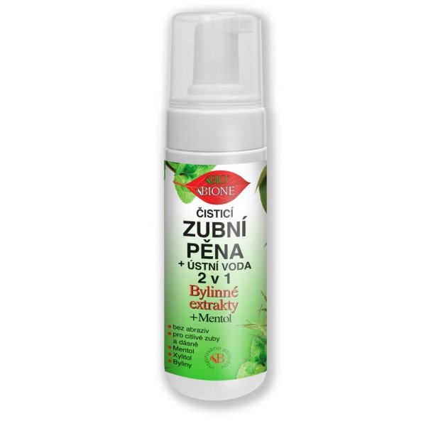 Popis produktu: Bione Cosmetics čisticí zubní pěna + ustní voda 2v1