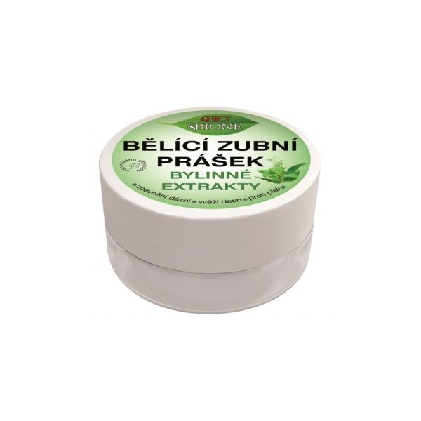 Bělící zubní prášek odstraňuje skvrny ze zubů, plak, černý i žlutý zubní kámen. Omezuje vznik parodontitidy, citlivost zubů, působí deodoračně a potlačuje mikroby. Odstraňuje kyselé pH. Zpevňuje dásně a zanechává svěží dech.