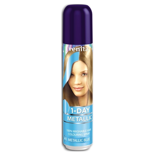 Metalický barevný sprej na vlasy v modré barvě. Je snadno smývatelný a je vhodný pro rychlé jednodenní "barvení" a oživení Vašich vlasů. Snadno se aplikuje a dodá vlasům překrásnou metalickou barvu. Ideální produkt pro party, karnevaly či festivaly. Jednoduše aplikujte na umyté a vysušené vlasy.