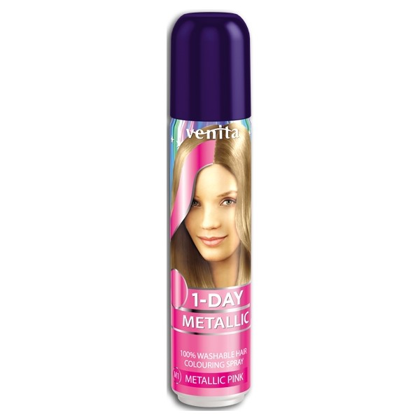 Metalický barevný sprej na vlasy v růžové barvě. Je snadno smývatelný a je vhodný pro rychlé jednodenní "barvení" a oživení Vašich vlasů. Snadno se aplikuje a dodá vlasům překrásnou metalickou barvu. Ideální produkt pro party, karnevaly či festivaly. Jednoduše aplikujte na umyté a vysušené vlasy.
