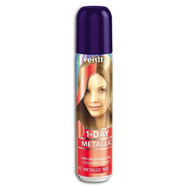 Metalický barevný sprej na vlasy v červené barvě. Je snadno smývatelný a je vhodný pro rychlé jednodenní "barvení" a oživení Vašich vlasů. Snadno se aplikuje a dodá vlasům překrásnou metalickou barvu. Ideální produkt pro party, karnevaly či festivaly. Jednoduše aplikujte na umyté a vysušené vlasy.