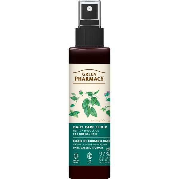 Vlasový elixír s obsahem lopuchu a kopřivy. Vhodný pro péči o normální vlasy. Zlepšuje stav vlasů, stimuluje jejich růst a posiluje. Lopuch dodává hloubkovou hydrataci a výživu. Zachovává přirozený lesk vlasů. Ty jsou hebké a hladké. Obsahuje až 97% složek přírodního původu.