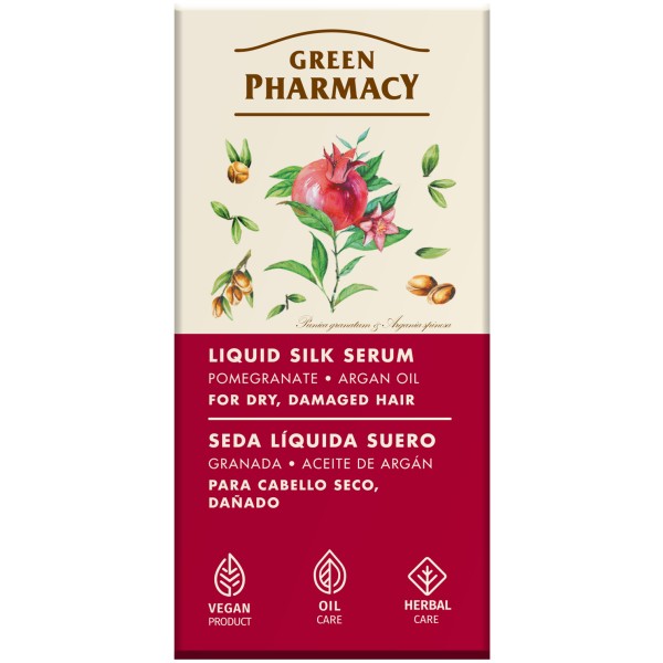 Tekuté hedvábné sérum s extraktem z granátového jablka, které posiluje silnou antioxidační ochranu, zjemňuje vlasy a dodává jim lesk. Arganový olej hloubkově vyživuje a hydratuje. Zlepšuje pružnost vlasů a jejich celkový vzhled. Hedvábné sérum obnovuje poškozené vlasy, chrání před negativními vlivy okolí a vlasy zanechá hladké, lesklé a přirozeně krásné.